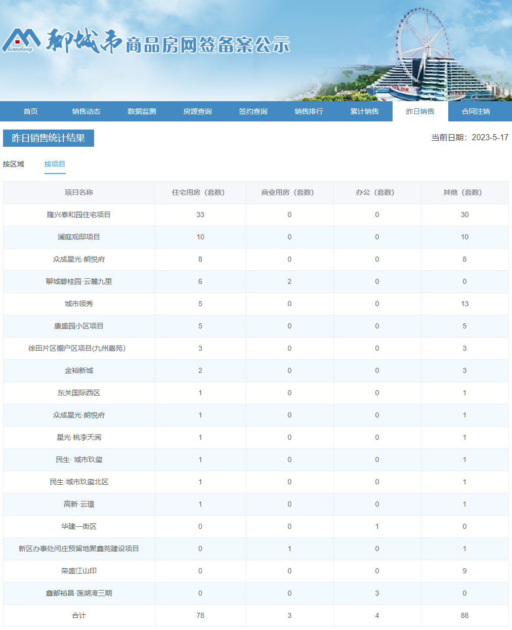 2023年5月16日,聊城市主城区商品房网签统计共173套。其中,住宅用房78套,商业用房3套,办公4套,其他88套。