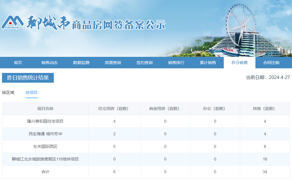 2024年4月26日,聊城市主城区商品房网签统计共40套。其中住宅用房6套,其他用房34套。