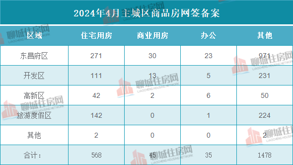 从房屋类型网签数据来看,4月份的网签量其他用房位列第一,共1478套,其中东昌府区网签971套,开发区网签231套,高新区网签50套,旅游度假区网签224套,其他用房2套;住宅用房位居第二,共568套,其中东昌府区网签271套,开发区网签111套,高新区网签42套,旅游度假区网签142套,其他地区2套;第三名为商业用房,共计45套,其中东昌府区网签30套,开发区网签13套,高新区网签2套;第四名为办公用房,共35套,其中东昌府区网签23套,开发区网签5套,高新区网签6套,旅游度假区1套。