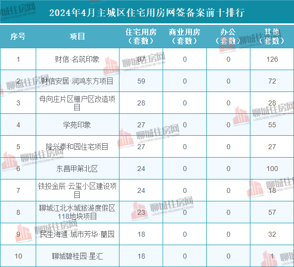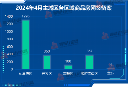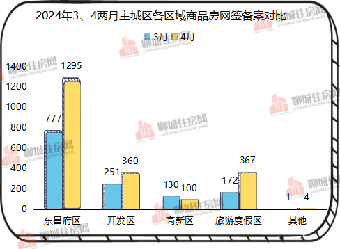 从区域网签数据来看,4月份的网签量东昌府区位列第一,共1295套,其中住宅用房网签271套,商业用房30套,办公23套,其他971套;旅游度假区位居第二,共367套,其中住宅用房142套,办公1套,其他224套;第三名开发区,共计360套,其中住宅用房111套,商业用房13套,办公5套,其他231套;第四名为高新区,共100套,其中住宅用房42套,商业用房2套,办公6套,其他50套。第五名为其他地区,共4套,其中住宅用房2套,其他2套。
