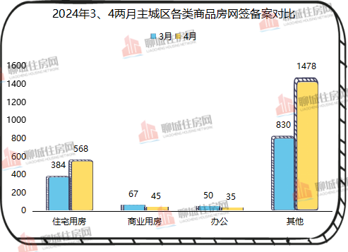 从房屋备案类型来看,3月、4月两月的网签数量对比,网签类型主要集中在住宅用房和其他类型上,商业和办公用房相对较少。