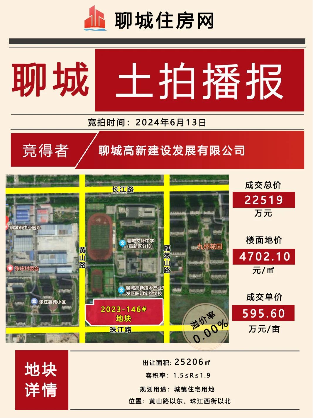 6月13日,2宗地块于聊城市公共资源交易中心网站集中竞拍,2宗地块均以底价成交,其中1宗为城镇住宅用地,1宗为工业用地。