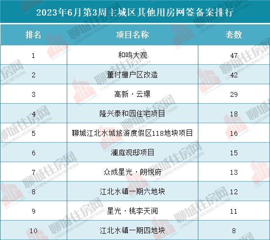 据住房网不完全统计,2023年6月第3周(2023.6.12-2023.6.18)聊城市主城区商品房网签备案数据共计485套!其中,住宅用房共205套,商业用房4套,办公1套,其他(车位、储藏室等其它房屋)为275套。