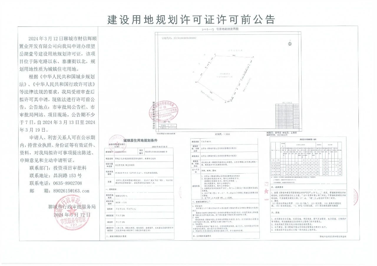 2024年3月12日,聊城市财信辉顺置业开发有限公司向我局申请办理望岳湖壹号建设用地规划许可证,该项目位于陈屯路以东、泰康街以北,规划用地性质为城镇住宅用地。 根据《中华人民共和国城乡规划法》、《中华人民共和国行政许可法》等法律法规的要求,我局受理审查后拟许可其申请,现依法进行许可前公告。公告地点:市审批局公告栏、市审批局网站、项目现场。公告期不少于7日,自2024年3月13日至2024年3月19日。 申请人、利害关系人可在公示期内,持营业执照、身份证等有效证件,资料,对我局拟许可事项提出陈述,申辩意见和主动申请听证。 联系部门:投资项目审批科 联系地址:昌润路153号 联系电话:0635-8902708 邮箱:8902615@163.com 聊城市行政审批服务局 2024年3月12日